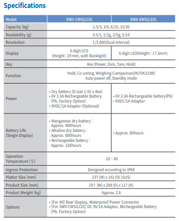 SWII-WS is damp-proof scale with Stainless steel upper housing to ensure the stable and long use of scale in damp environment such as food processing applications and fish markets. Also, it is easy to carry and its stabilization time of less than 0.6s makes fast and accurate operation.