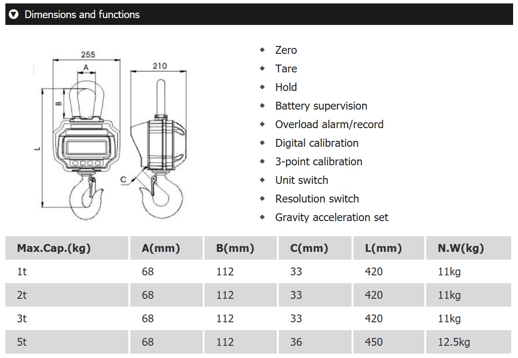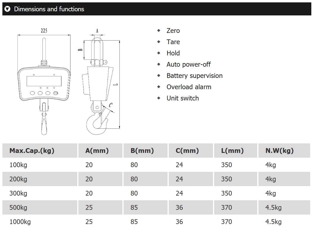 • Function: Zero, Tare, Hold, Auto power-off, Battery status, Overload alarm, Unit switch kg/ Lb., digital calibration, Resolution switch